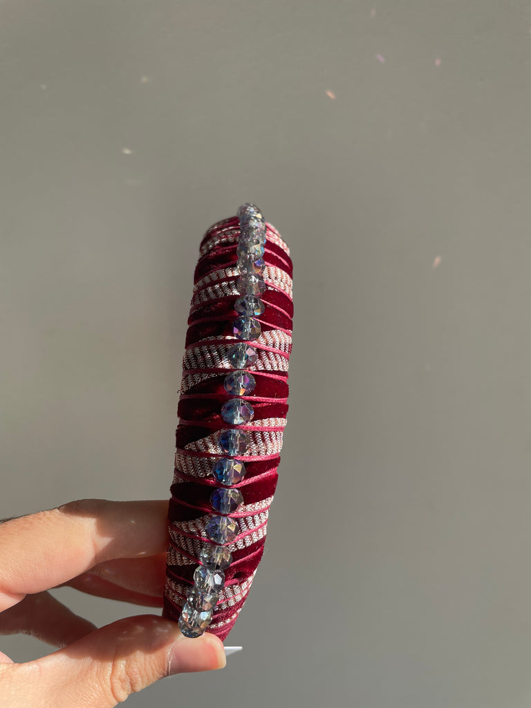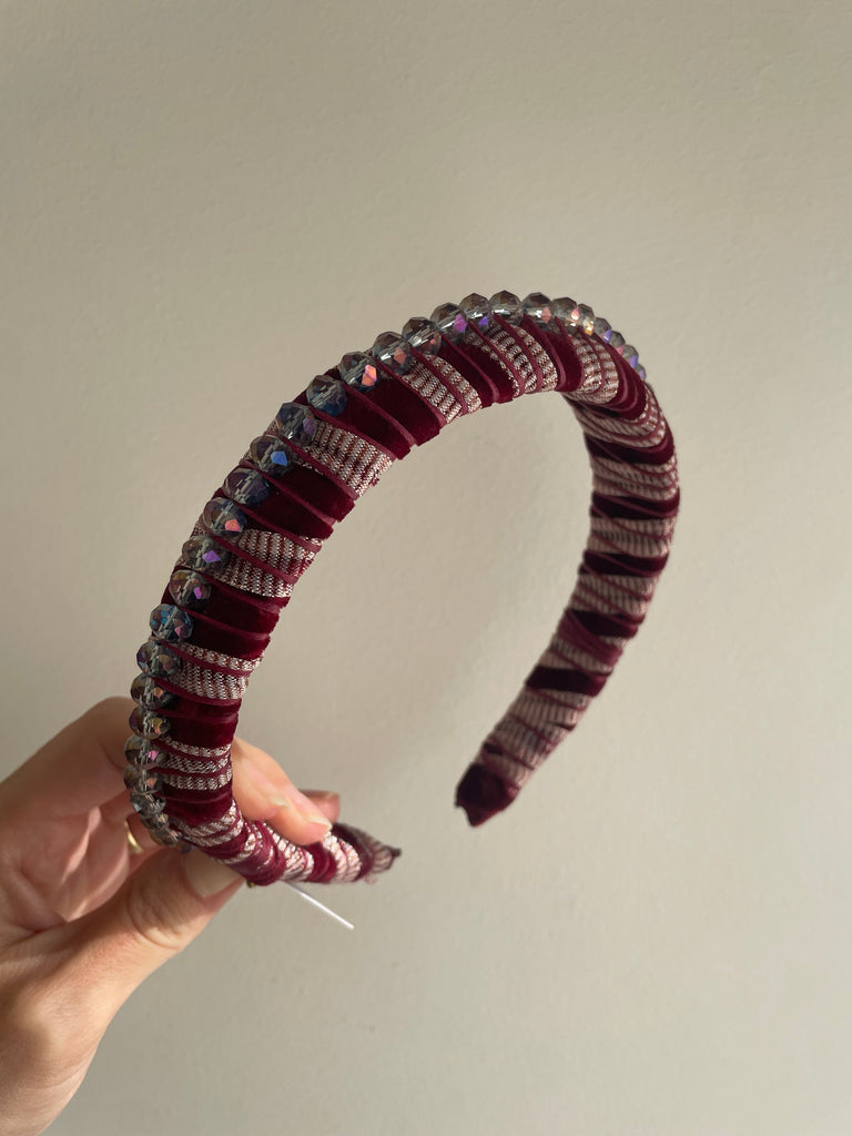 Profunda, elegante y extraordinariamente cómoda. Esta exclusiva diadema en tonos burdeos está confeccionada en cinta de terciopelo y delicadamente adornada con cristales Swarovski que aportan un brillo sofisticado y envolvente.