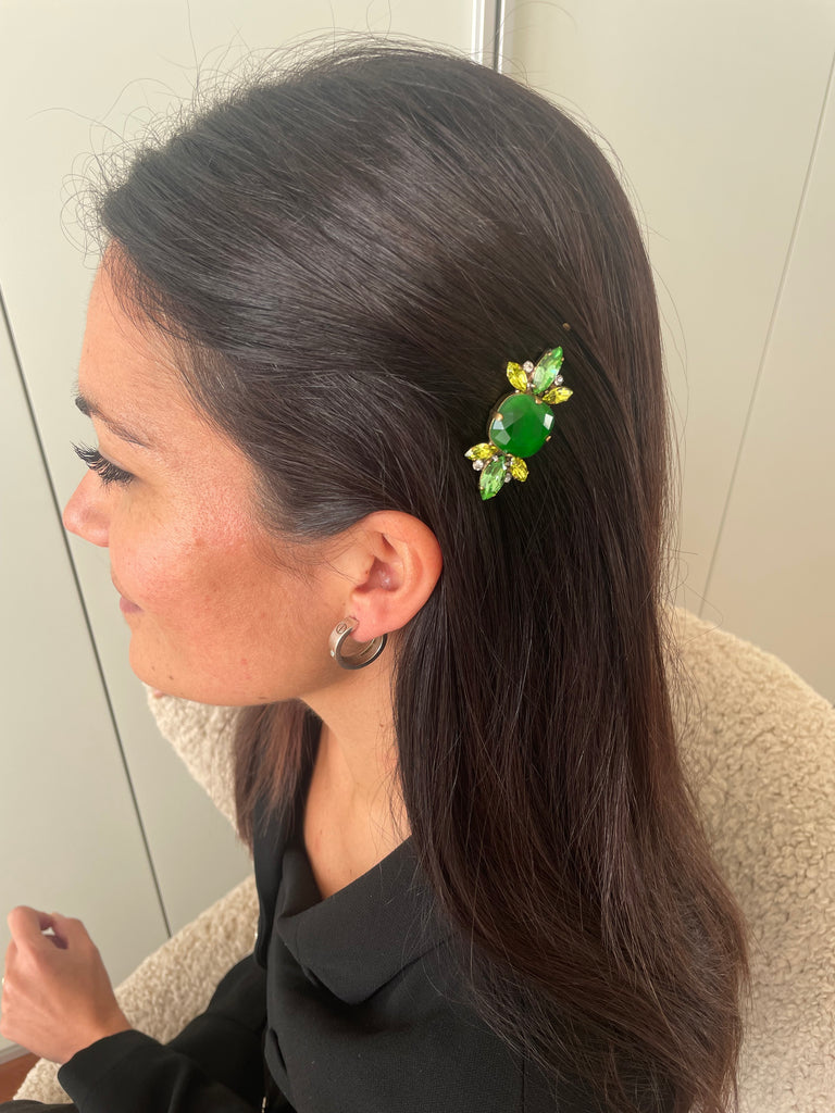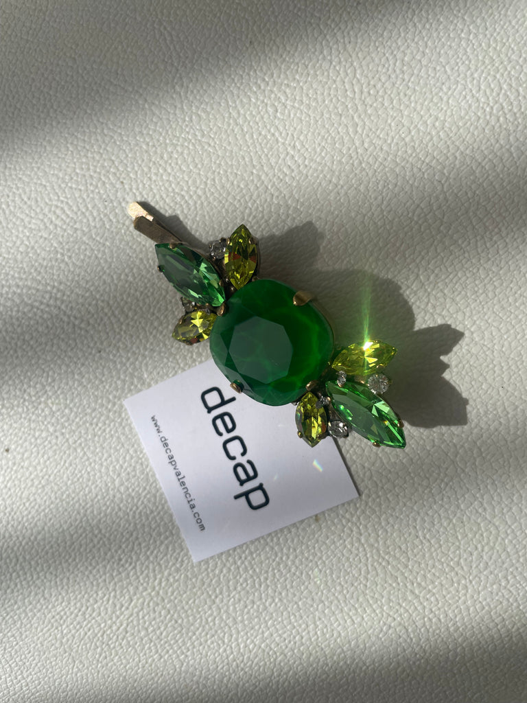 Horquilla para el cabello adornada con cristales Swarovski en sofisticados tonos verdes, diseñada para recoger el cabello con la máxima comodidad y aportar luz y elegancia al peinado. Su delicada composición refleja la luz con un brillo refinado y armonioso.