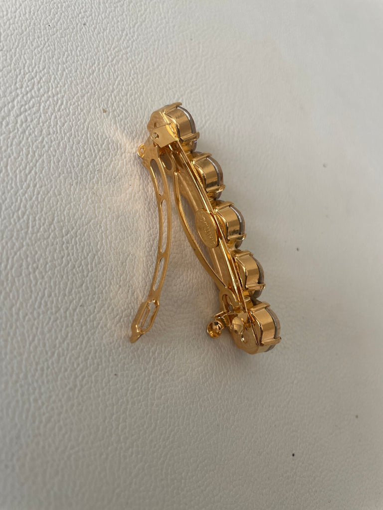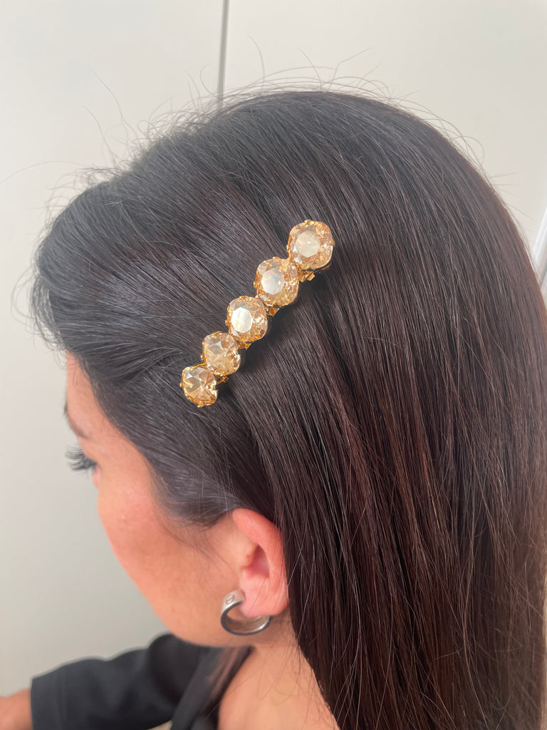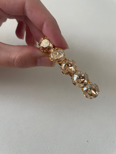 Cinco cristales Swarovski de talla facetada, alineados con precisión, crean un efecto luminoso y refinado que realza el cabello con destellos cálidos y elegantes. Su diseño limpio y equilibrado convierte este pasador en un accesorio atemporal, ideal para quienes buscan un detalle joya sutil pero impactante.