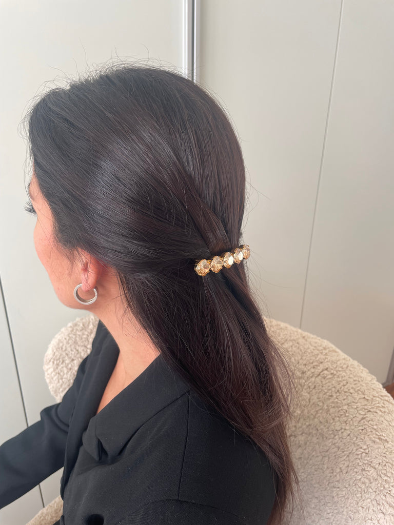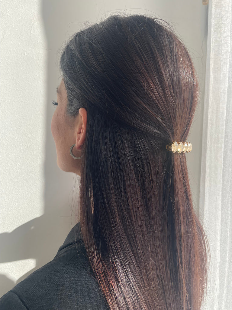 Su tamaño es perfecto para semirecogidos, para retirar los mechones laterales o como detalle decorativo en recogidos, aportando un toque de lujo discreto tanto en looks de día como de noche.