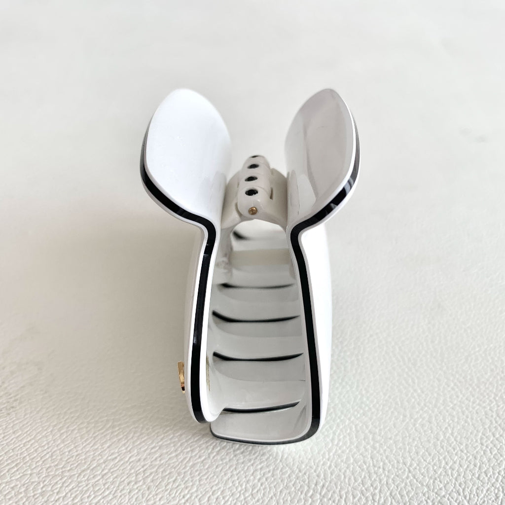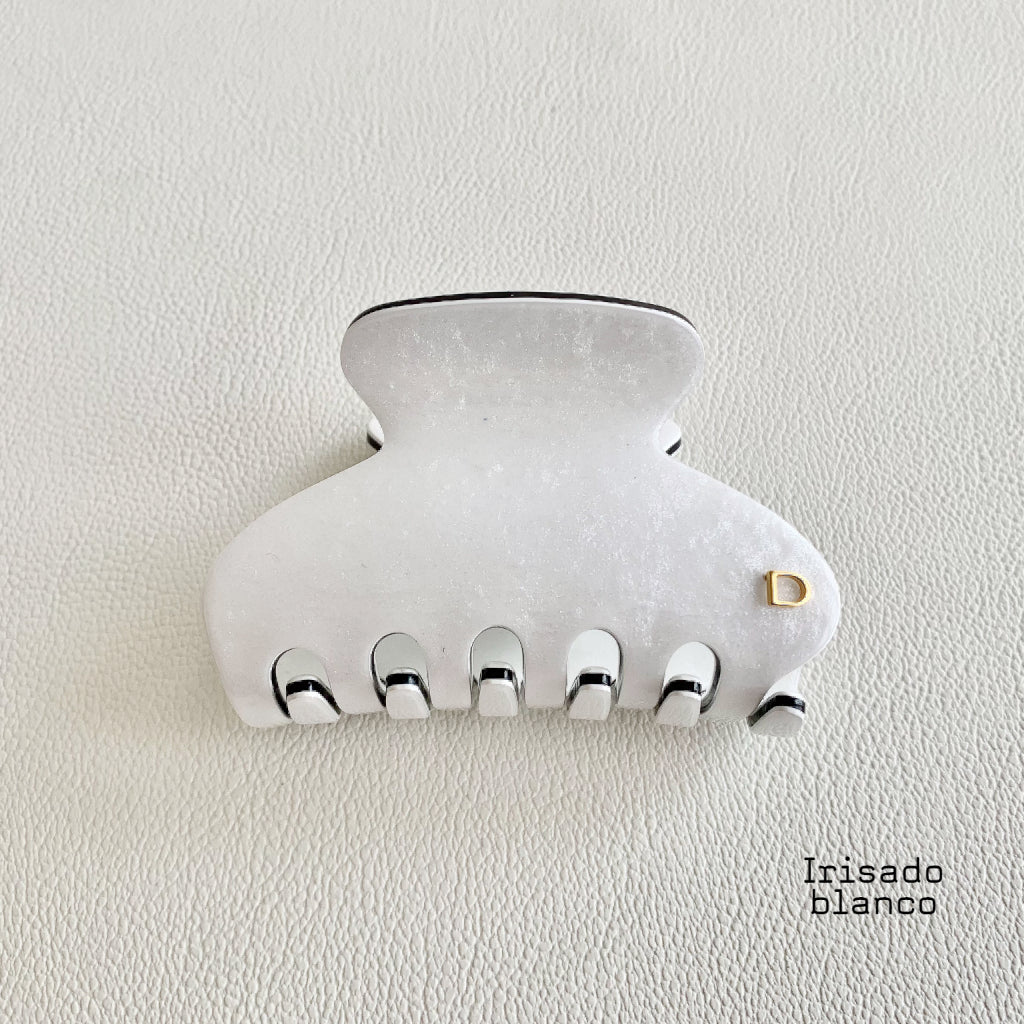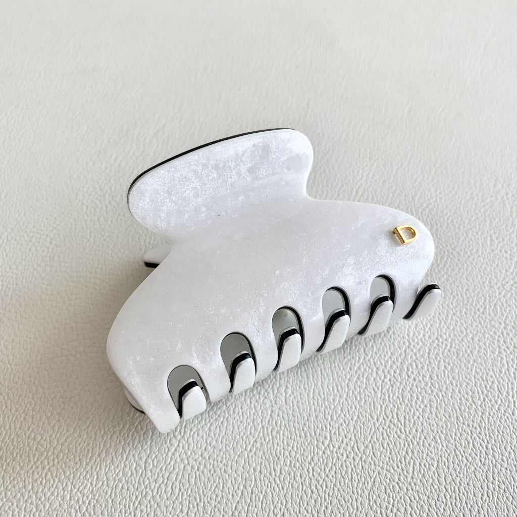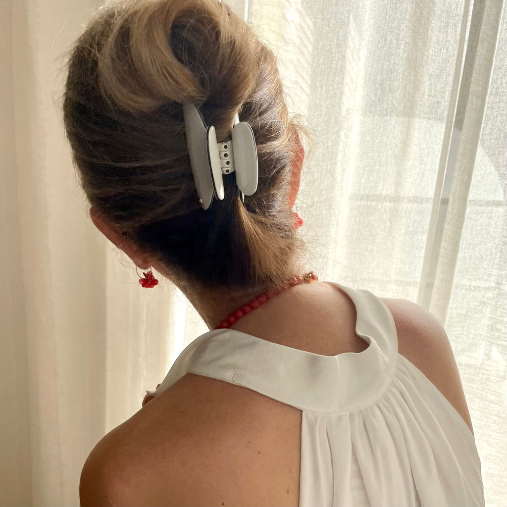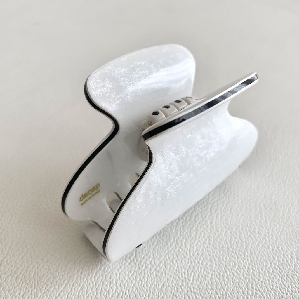 Realizada en tres capas de exclusivo acetato de celulosa biodegradable, Cristales Swarovski y caucho natural, la Pinza Mediana Luxe en acabado irisado blanco con contrastes en negro es delicada y elegante.