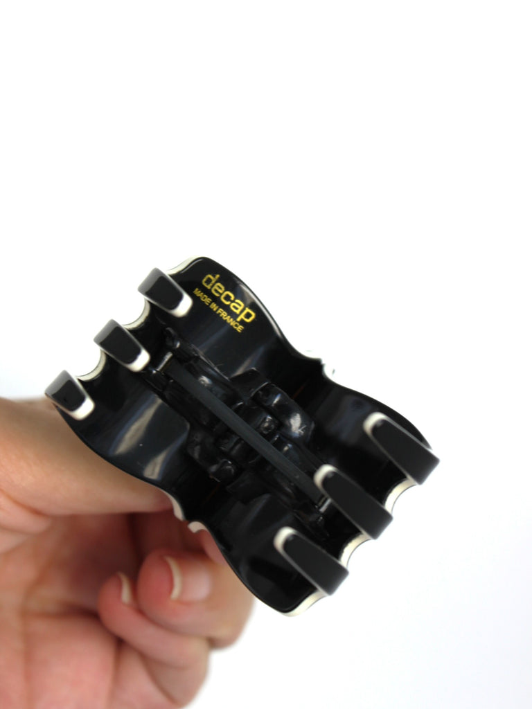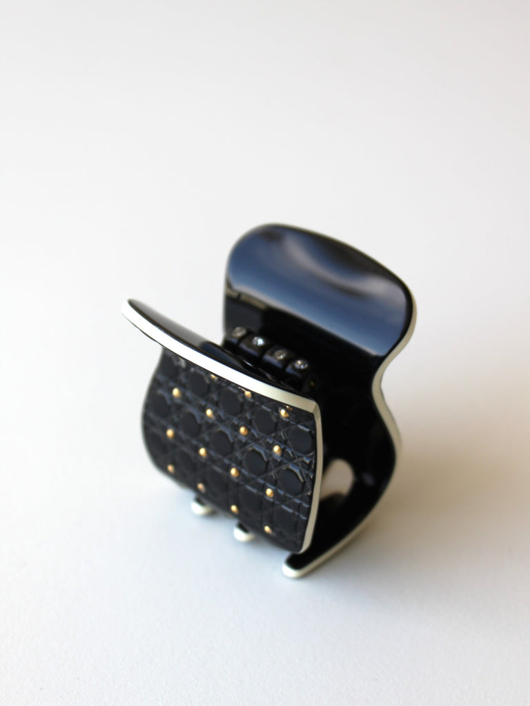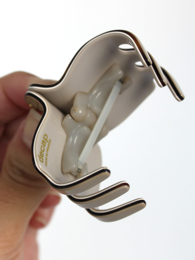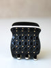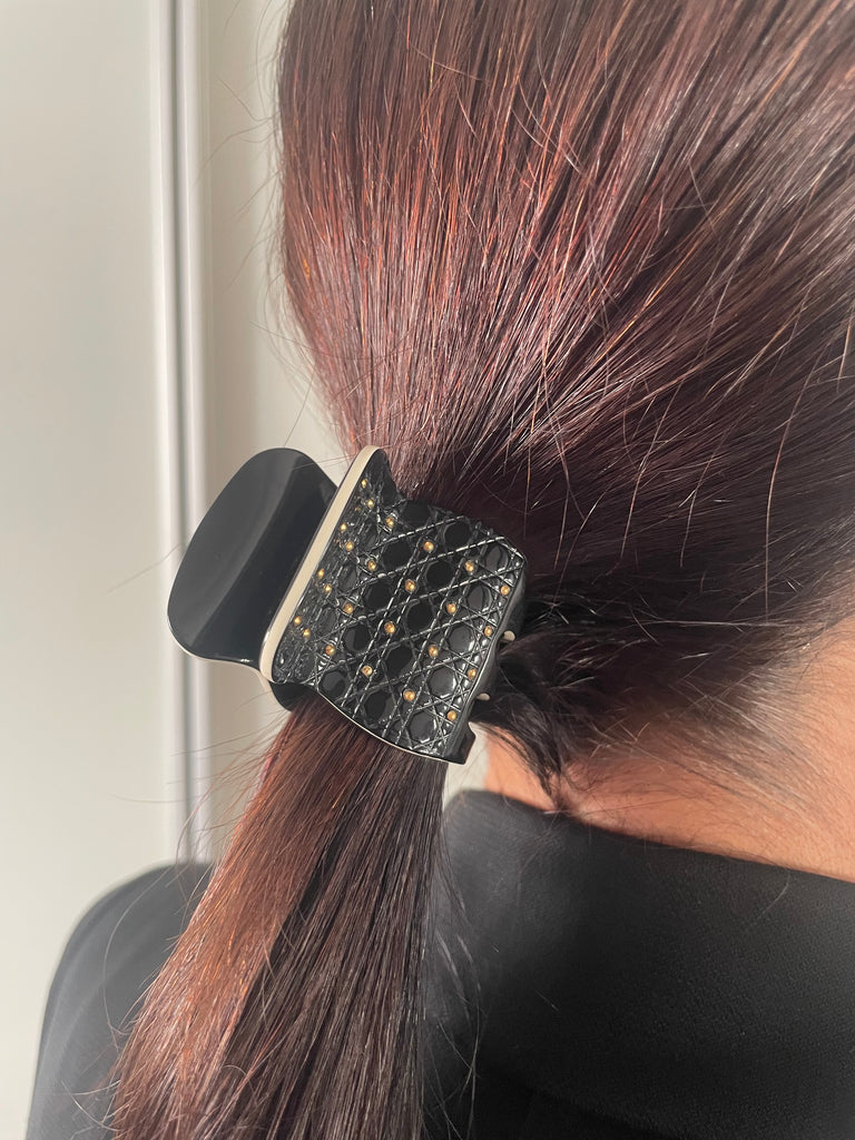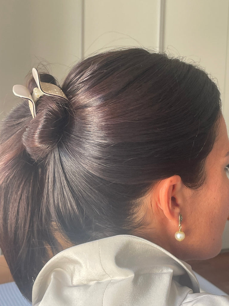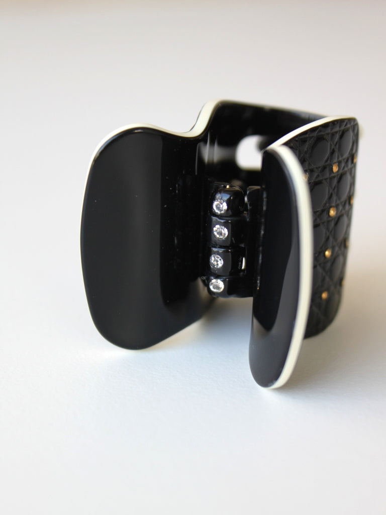 Fabricada con un exclusivo muelle de caucho, Cristales Swarovski y tres capas de acetato de celulosa biodegradable de alta calidad.  Esta pieza única ofrece una suave sujeción del cabello impecable que hará de su peinado del día a día un complemento de lujo.